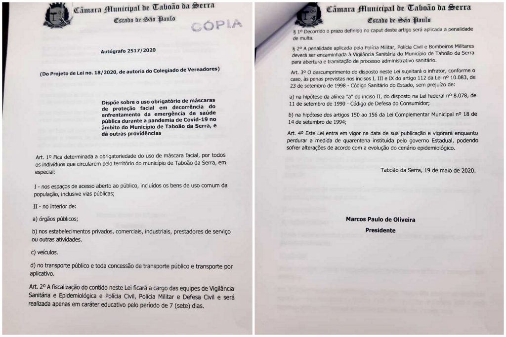 O primeiro obriga o uso de máscaras dentro dos veículos. O segundo estabelece penalidades, incluindo multas que variam entre R$ 276 a R$ 276 mil. Há também a possibilidade de advertência e interdição parcial ou total de estabelecimentos e veículos. Durante 7 dias a fiscalização terá caráter educativo. O projeto foi sancionado pelo prefeito Fernando Fernandes (PSDB) e já está em vigor.