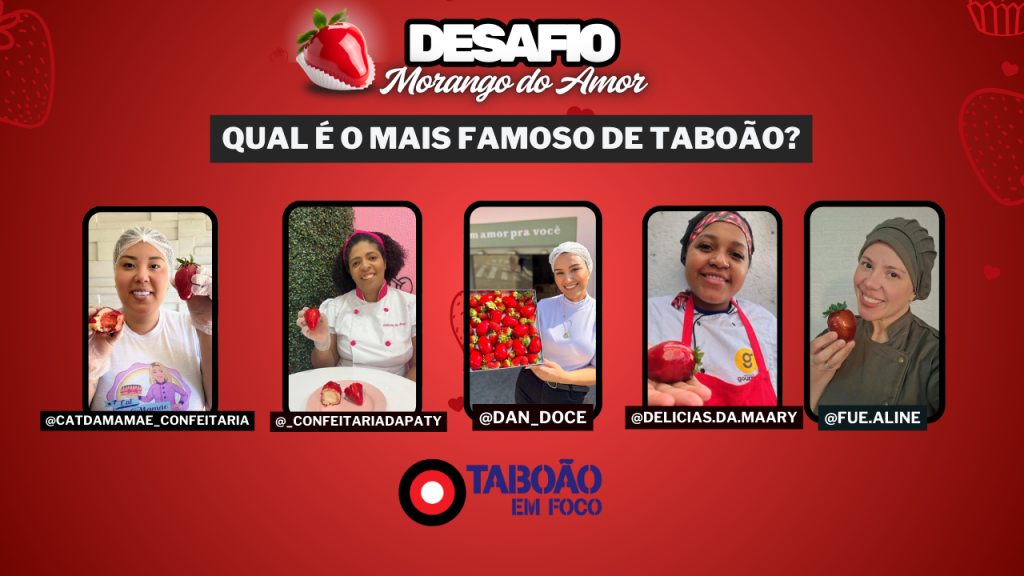 A etapa final do desafio Morango do Amor Mais Famoso de Taboão começa nesta quinta-feira (14) e vai até às 23h59 de domingo, 17 de agosto, quando será encerrada. O doce vencedor ganhará o título de Mais Famoso de Taboão e uma reportagem do Taboão em Foco.