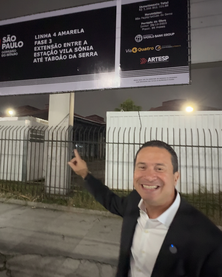 Durante o encontro, Nóbrega aproveitou o momento para mostrar ao governador uma foto da placa instalada no antigo terreno da Sorana Sul, que marca oficialmente o início das obras de extensão da Linha 4-Amarela do Metrô até Taboão da Serra.
