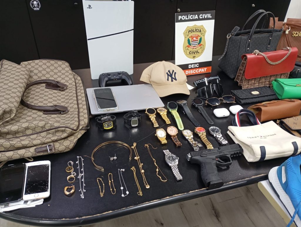 Durante as diligências, os policiais apreenderam dois veículos, dinheiro em espécie, relógios, celulares, bolsas e diversas joias. Em um dos carros, localizado em uma concessionária, foi encontrada uma pistola com numeração raspada, além de carregador e munições.