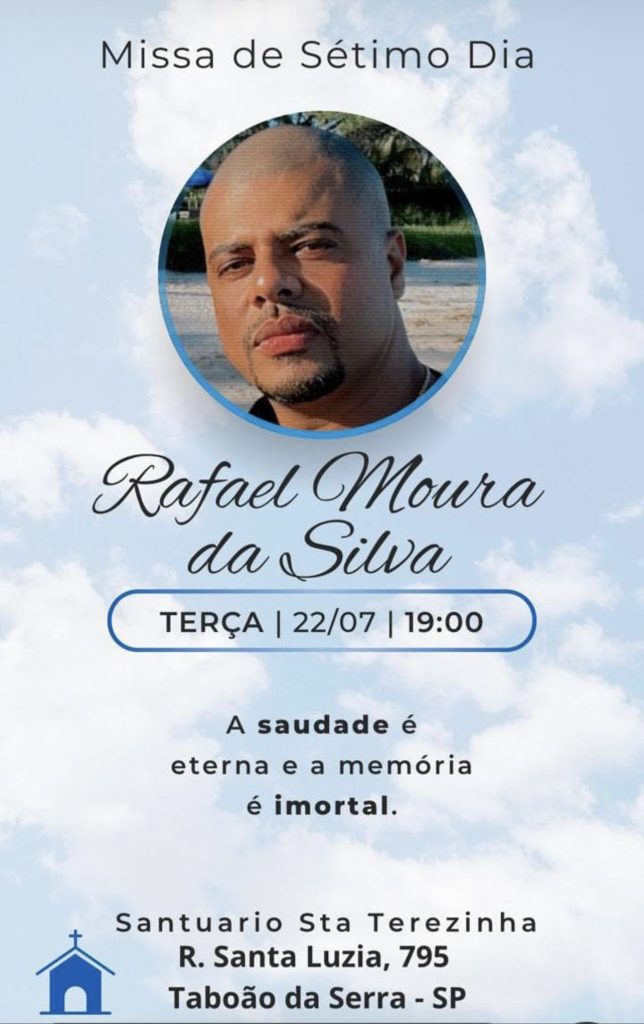A missa de sétimo dia do policial civil Rafael Moura da Silva, de 38 anos, acontece nesta terça-feira, 22 de julho, às 19h, no Santuário Santa Terezinha, em Taboão da Serra. A celebração é aberta ao público e será realizada na Rua Santa Luzia, nº 795, no Jardim Maria Rosa.