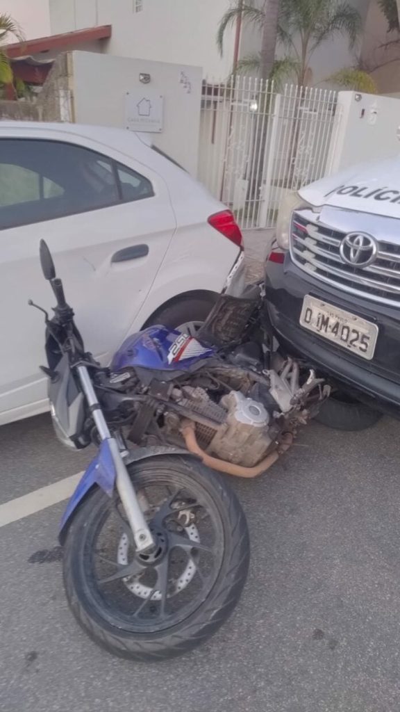Durante a fuga, o suspeito colidiu a moto — que também era produto de roubo — e sofreu ferimentos na perna, sendo levado para atendimento hospitalar.