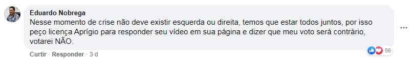 O vereador Eduardo Nóbrega (MDB) comentou. “Nesse momento de crise não deve existir esquerda ou direita, temos que estar todos juntos, por isso peço licença Aprígio para responder seu vídeo em sua página e dizer que meu voto será contrário, votarei NÃO”, postou.