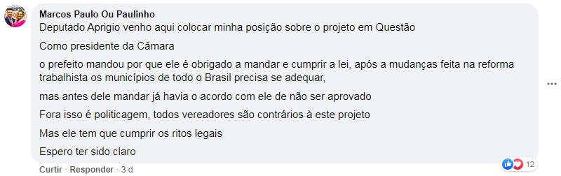 O presidente da Câmara, Marcos Paulo (PSDB), defendeu o envio do projeto, mas afirma ter acordo para votação contrário a mudança. “O prefeito mandou por que ele é obrigado a mandar e cumprir a lei, após a mudanças feita na reforma trabalhista os municípios de todo o Brasil precisa se adequar, mas antes dele mandar já havia o acordo com ele de não ser aprovado. Fora isso é politicagem, todos vereadores são contrários à este projeto”, comentou.